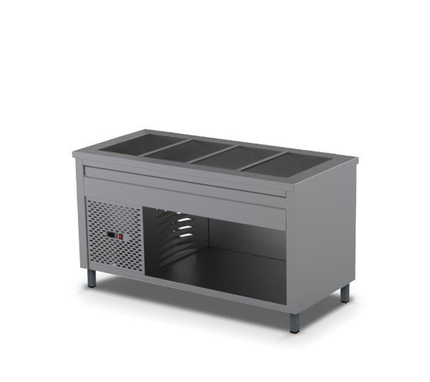 • Digitális vezérlés (4-8 °C), három oldalon burkolt, a kiszolgáló tér felől nyitott, alsó polc