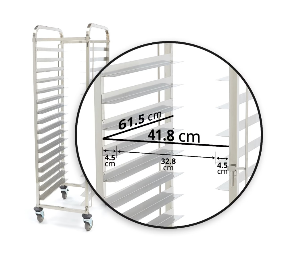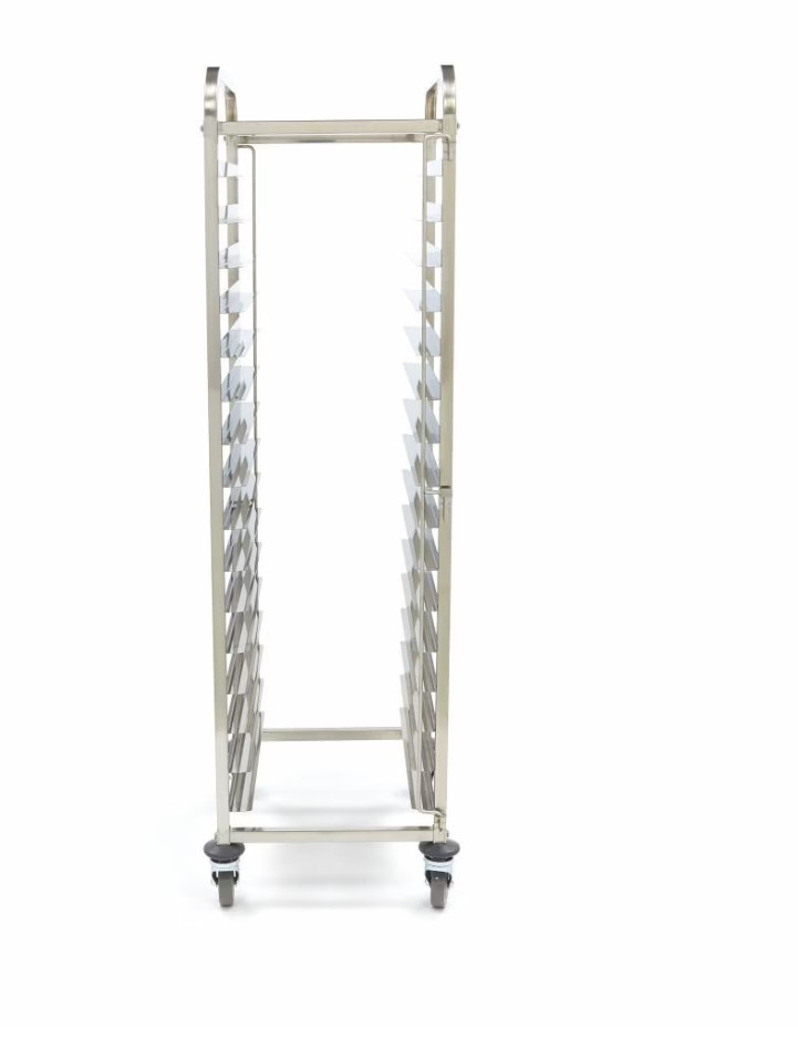 Ez a rozsdamentes acél tálcakocsi professzionális konyhai használatra, elsősorban pékségek, éttermek és szállodák kiszolgálására készült. Az állvány 16 tálca számára biztosít helyet, és a szabványos Bakerynorm (60 x 40 cm) méretű tálcákkal kompatibilis. A lapraszerelt konstrukciónak köszönhetően az eszköz gyorsan és egyszerűen összeszerelhető.