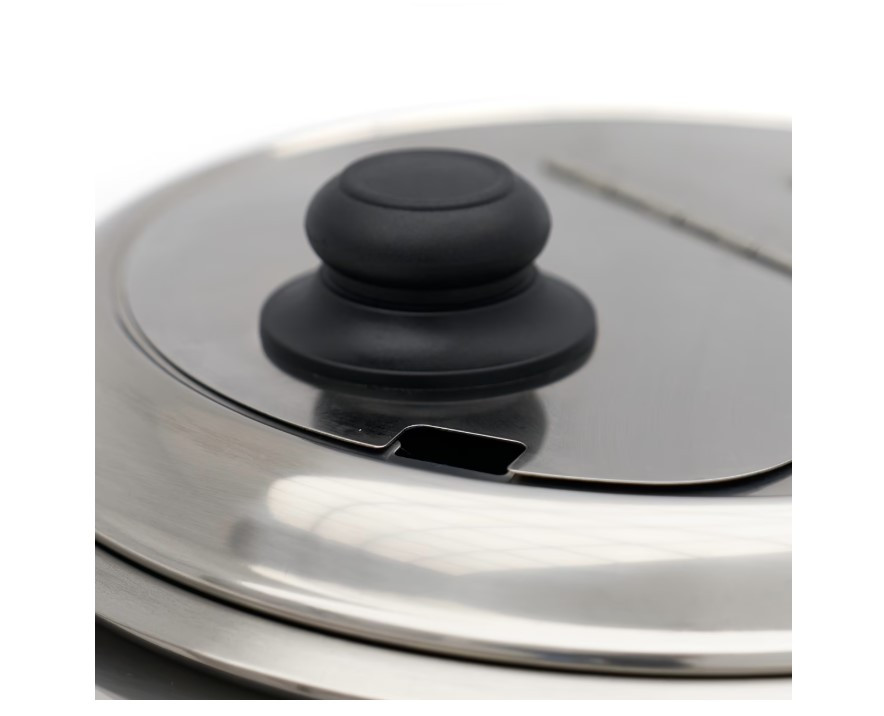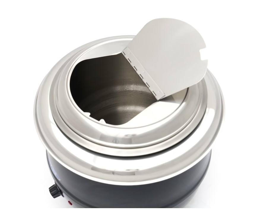 A készülék robusztus, fekete bevonatos alumínium házzal rendelkezik, amely ellenáll az intenzív napi igénybevételnek. A működése a vízfürdős (bain-marie) elven alapul, így a leves melegen tartása anélkül történik, hogy odaégne. Egyszerűen töltse fel a víztartályt a jelzésig, és állítsa be a kívánt hőmérsékletet a 12 fokozatú forgatógombbal. Az okos fedélkialakításnak köszönhetően nem kell az egész fedelet levenni a tálaláshoz: a beépített csapóajtó és a merőkanál-kivágás gyorsítja a kiszolgálást, és segít bent tartani a hőt. A csúszásmentes gumitalpak garantálják a stabilitást bármilyen felületen.