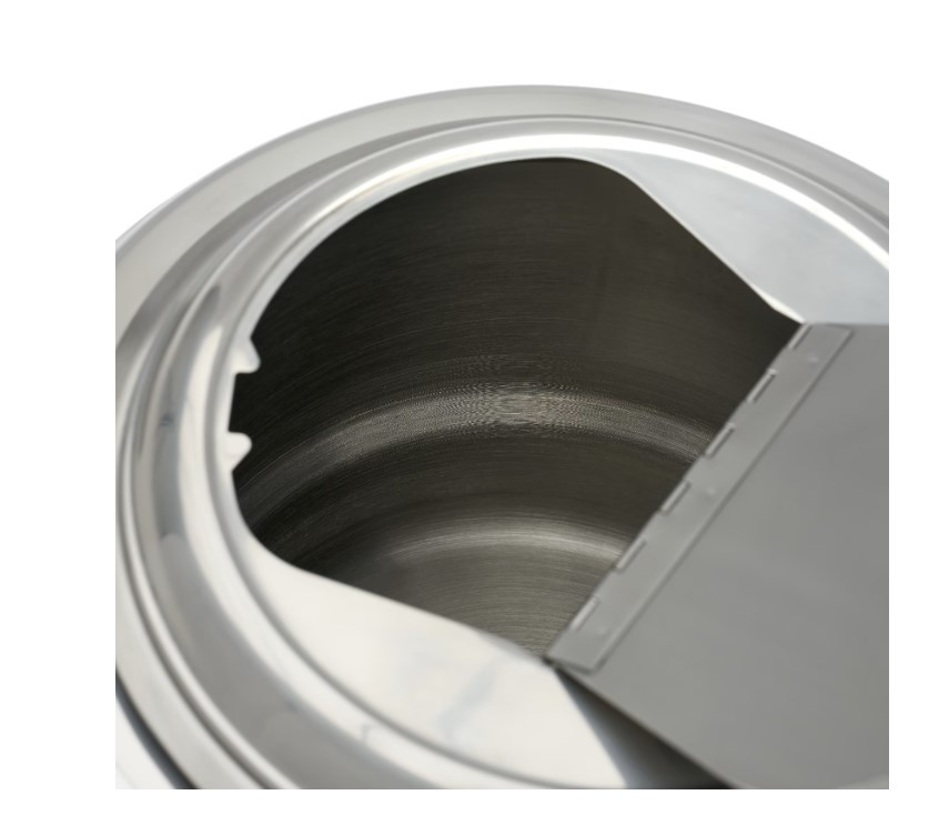 A belső tartály teljes egészében rozsdamentes acélból készült és kivehető, így a tisztítása rendkívül egyszerű és higiénikus. A külső alumínium burkolat egy nedves ruhával könnyen letörölhető. A fedél és a csapóajtó kialakítása szintén támogatja a gyors tisztítást. A hosszú élettartam érdekében javasoljuk a víztartály rendszeres vízkőmentesítését. Mielőtt újra használná, törölje szárazra az elemeket.