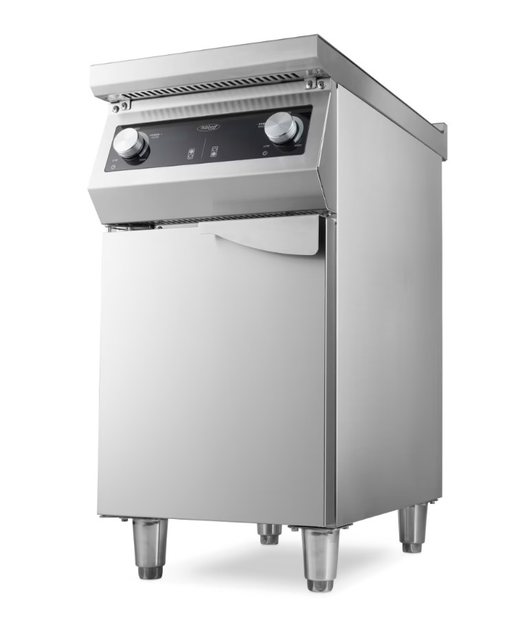 A rendezett munkaterület kulcsfontosságú a hatékony munkavégzéshez a professzionális konyhákban. A szükséges eszközök keresgélése sok időt pazarol el, ami egy forgalmas nagykonyhában komoly fennakadásokat okozhat. A beépített extra tárolóhely nagy segítség, hogy a legfontosabb eszközök mindig kéznél legyenek. Ez a főzőlap egy egyajtós szekrénnyel rendelkezik, amelyben bármilyen további szükséges eszközt tárolhat.