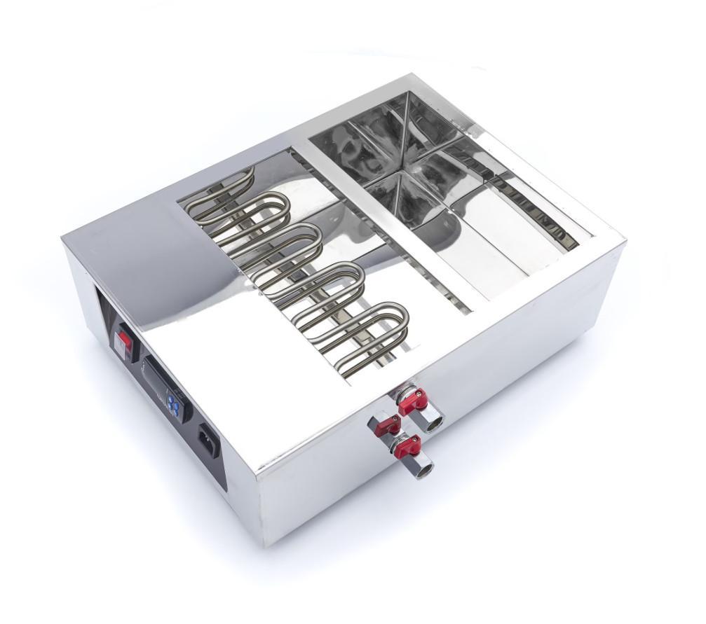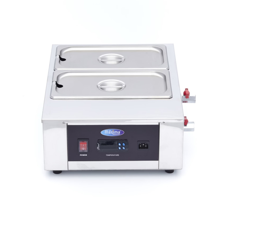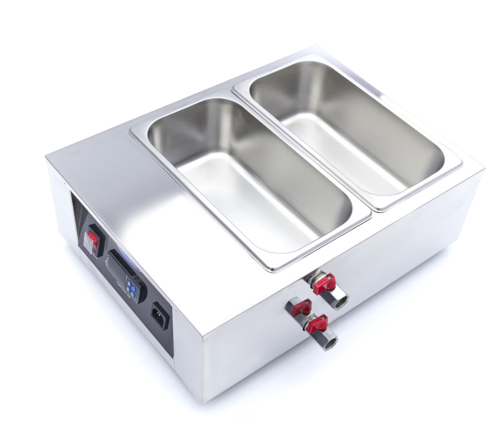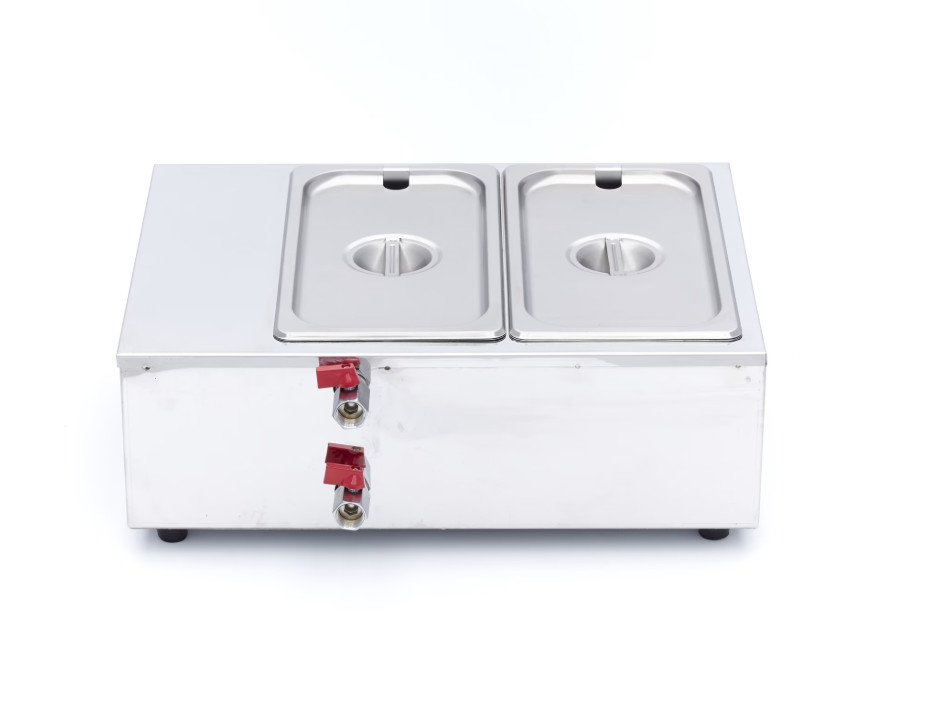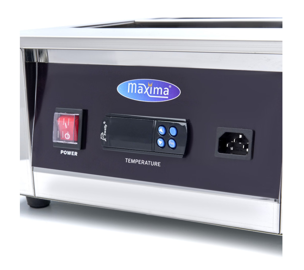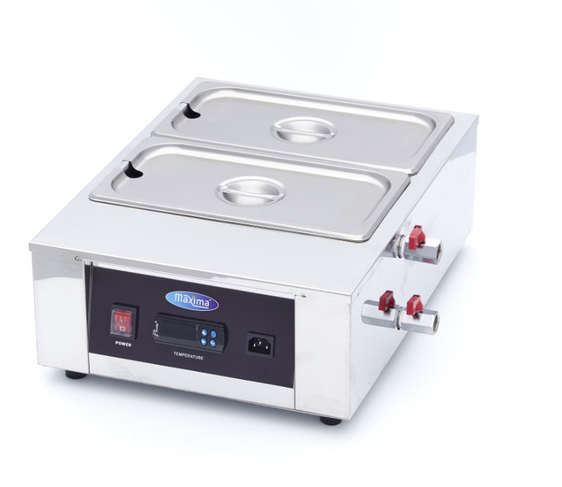 Precíz vezérlés és biztonság A készülék kezelőpanelje felhasználóbarát: egy be/kikapcsoló gombból és egy digitális kijelzőből áll. A hőmérsékletet a nyílgombok segítségével fokonként állíthatja be 3 és 100°C között, ami rendkívül pontos hőtartást tesz lehetővé. Ez kritikus fontosságú a csokoládé temperálásánál vagy érzékeny szószok melegen tartásánál. A tervezésnél kiemelt figyelmet kapott a biztonság. A gép oldalán két leeresztő található: az alsó csap segítségével gyorsan és forrázásveszély nélkül engedheti le a vizet a tartályból. A felső szelep a felesleges gőz elvezetésére szolgál, így amikor kiveszi a csokoládéval teli edényeket, nem csapja meg a kezét a forró gőz.