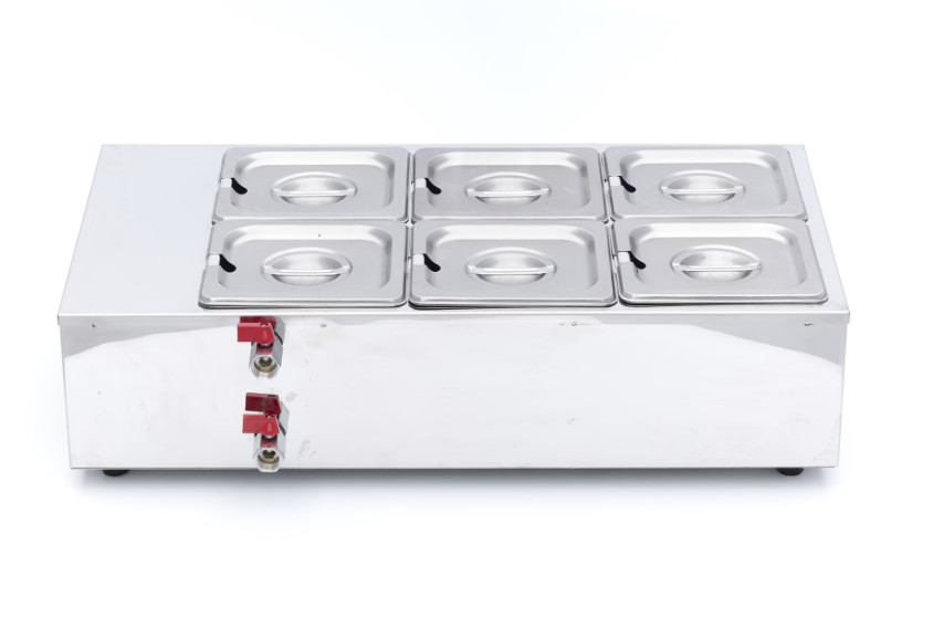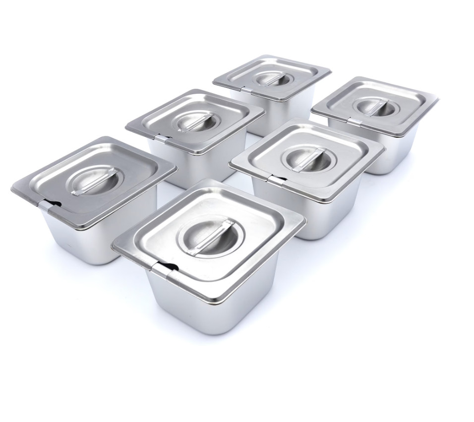 A csomag teljes körű megoldást kínál: tartalmazza a hat darab 1/6 GN méretű, 10 cm mélységű rozsdamentes edényt a hozzájuk illő fedőkkel. A csomag részét képezik a speciális köztes hidak és tartók is, amelyek biztosítják, hogy a GN edények stabilan a helyükön maradjanak, és ne ússzanak el vagy billenjenek meg a vízfürdőben.