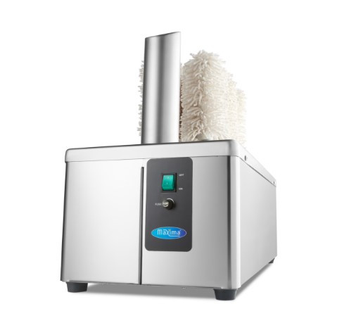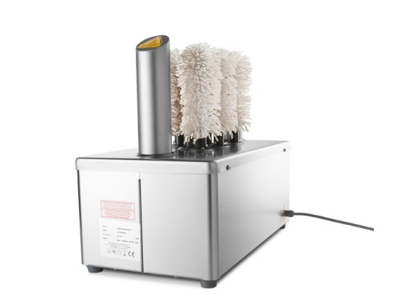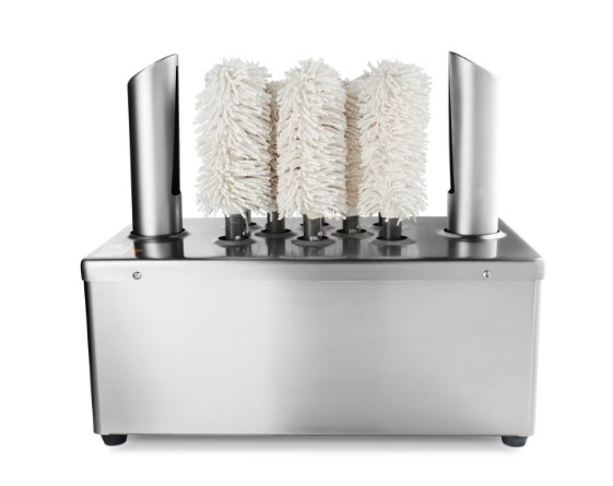 - 8 kefés konfiguráció: A gép 6 db nagyméretű külső kefével és 2 db központi kis kefével rendelkezik. Ez a kialakítás lehetővé teszi, hogy egyszerre tisztítsa a pohár külső palástját, talpát és belső kelyhét.