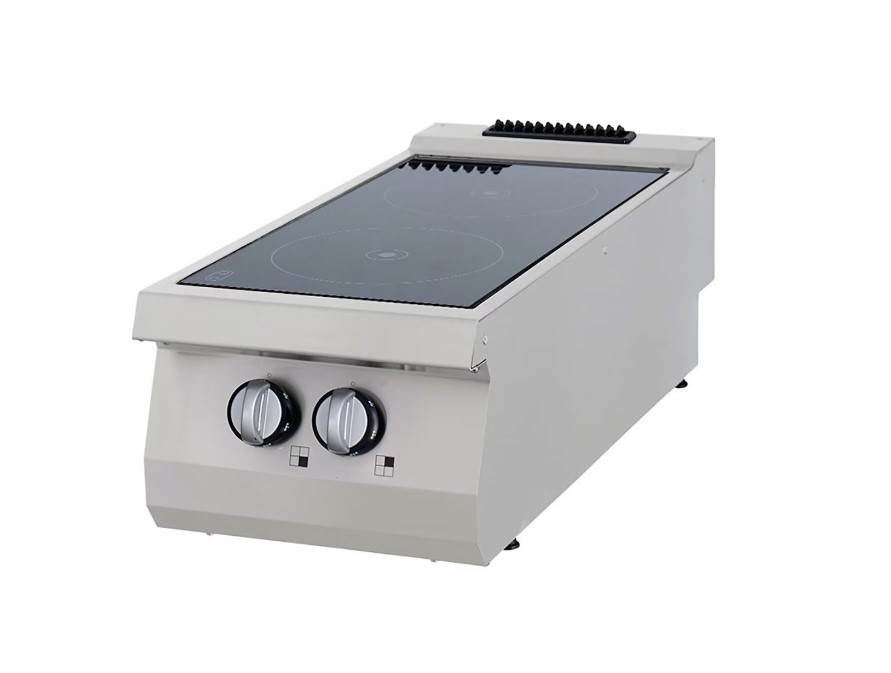 A 6 mm vastag kerámia főzőlapot robusztus rozsdamentes acél ház erősíti, amely ellenáll a mindennapos kopásnak. A felület körüli vízálló tömítés védi az egységet a nedvességtől, ami egy forgalmas kereskedelmi konyhában elengedhetetlen. A rugalmasság növelése érdekében ez az egység kombinálható a hozzá illő nyitott állvánnyal vagy egy zárt, ajtós alsó szekrénnyel (ezek külön rendelhetők).