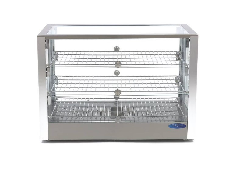 A vitrin egyik legnagyobb előnye a kétoldali ajtórendszer. Az elülső oldalon található nyíló ajtók lehetővé teszik, hogy a vendégek önkiszolgáló rendszerben vegyék ki a termékeket (ha az üzletmenet ezt kívánja), míg a hátsó ajtók a személyzet számára teszik gyorssá és egyszerűvé a készlet feltöltését vagy a kiszolgálást. A nagy teljesítményű fűtőelem hatékonyan és egyenletesen oszlatja el a hőt a vitrin belsejében. A készülék egy speciális víztartállyal is rendelkezik a levegő párásítására, így a behelyezett pékáruk és ételek nem száradnak ki, hanem frissek maradnak. A hőmérséklet egy egyszerű analóg tárcsával fokozatmentesen állítható 30 és 90ºC között, a beállított hőfok elérését pedig visszajelző lámpa jelzi.