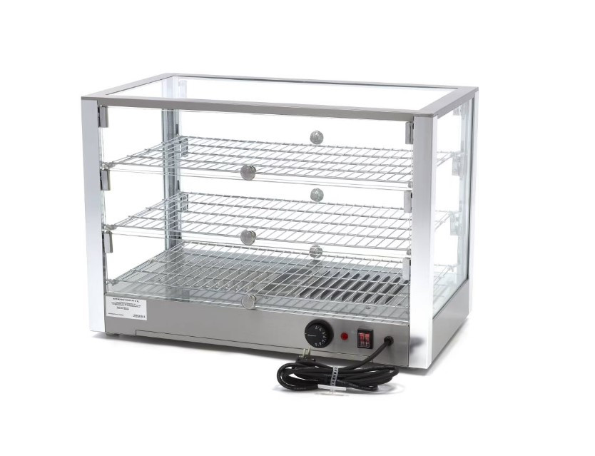 Ez a professzionális melegentartó vitrin ideális megoldás péksütemények, snackek és egyéb ételek melegen tartására és bemutatására. A 115 literes űrtartalommal és 70 cm-es szélességgel rendelkező készülék három krómozott polccal és beépített világítással segíti a termékek vonzó prezentálását. A rozsdamentes acél konstrukció és a kétoldali ajtók biztosítják a tartósságot és a könnyű kezelhetőséget.