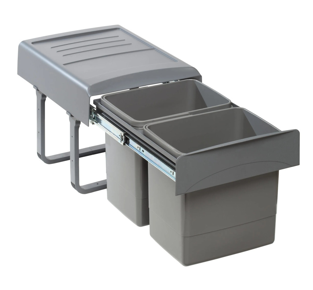 Szekrénybe szerelhető, teljesen kihúzható, lágyan záródó hulladékgyűjtő rendszer, szelektív hulladékgyűjtéshez.