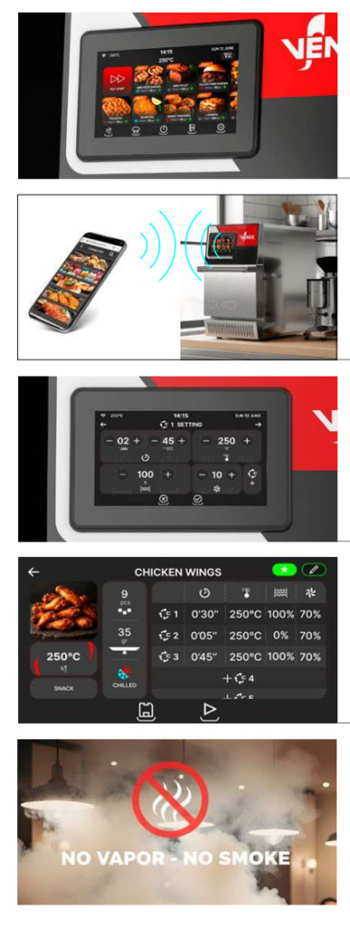 A nagyméretű, 7 colos érintőképernyő egyszerű és logikus felületet kínál, amely minden műveletet gyorssá és hibamentessé tesz. Navigáljon könnyedén a receptek között, szabja személyre a programokat, és irányítson minden részletet néhány érintéssel – így a precizitás maximális, a személyzet betanítási ideje pedig minimális lesz.