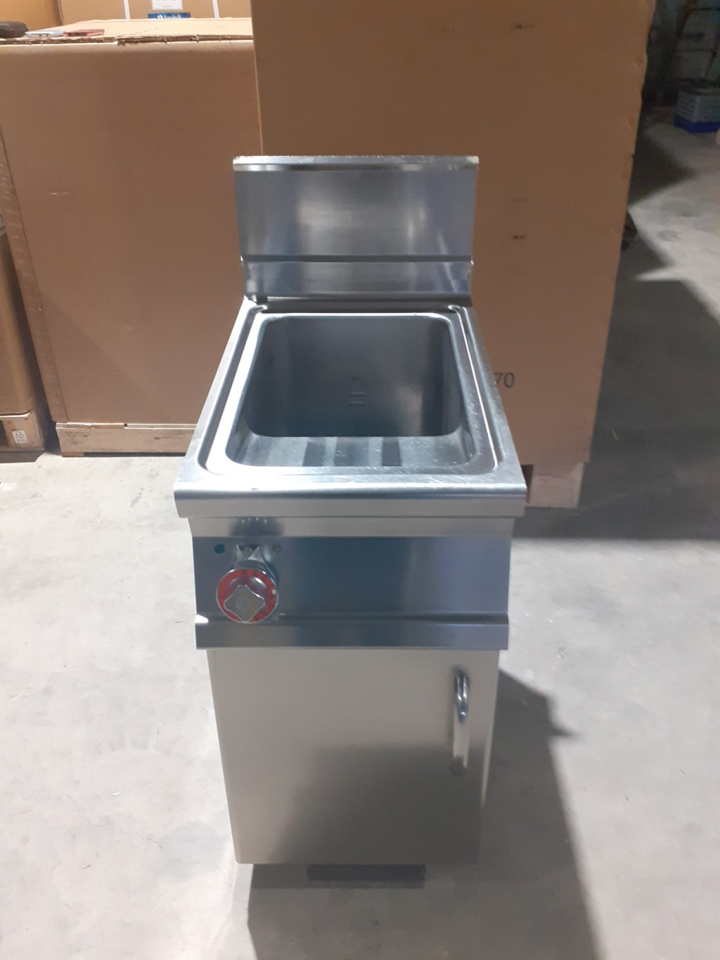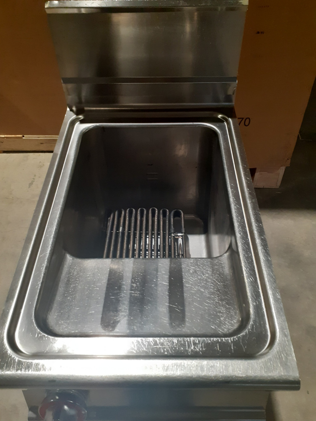 háromfázisú, elektromos ipari olajsütő, fritőz berendezés, rozsdamentes acélból, tárolóval, 13 literes medencével, IPX5 védelemmel.