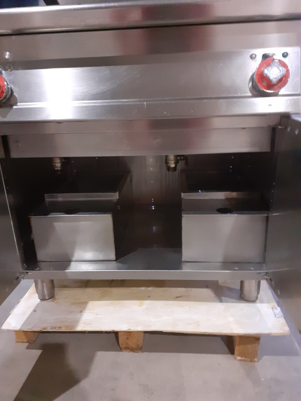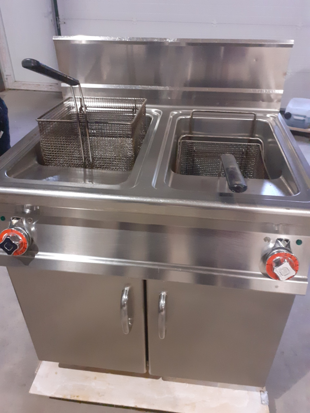 háromfázisú, elektromos ipari olajsütő, fritőz berendezés, rozsdamentes acélból, tárolóval, 2×13 literes medencével, IPX5 védelemmel.
