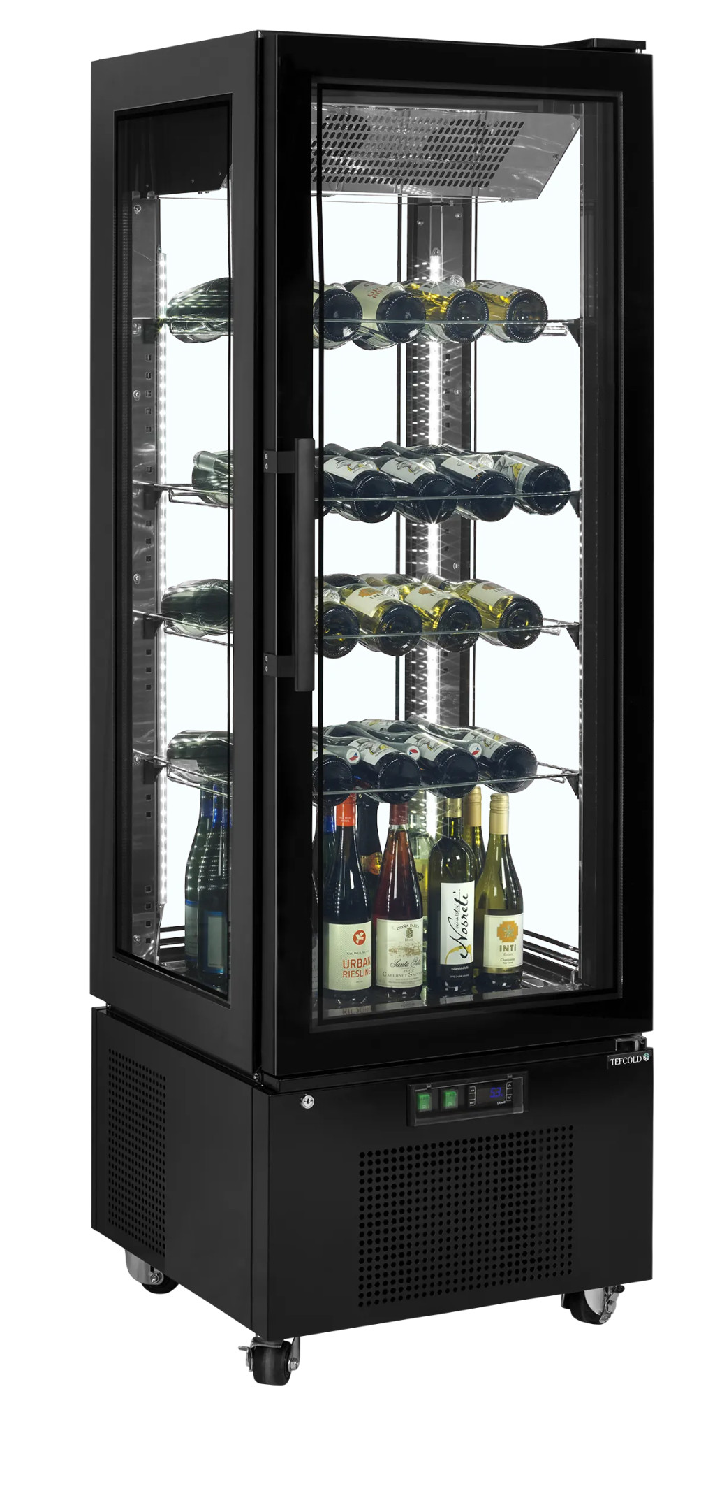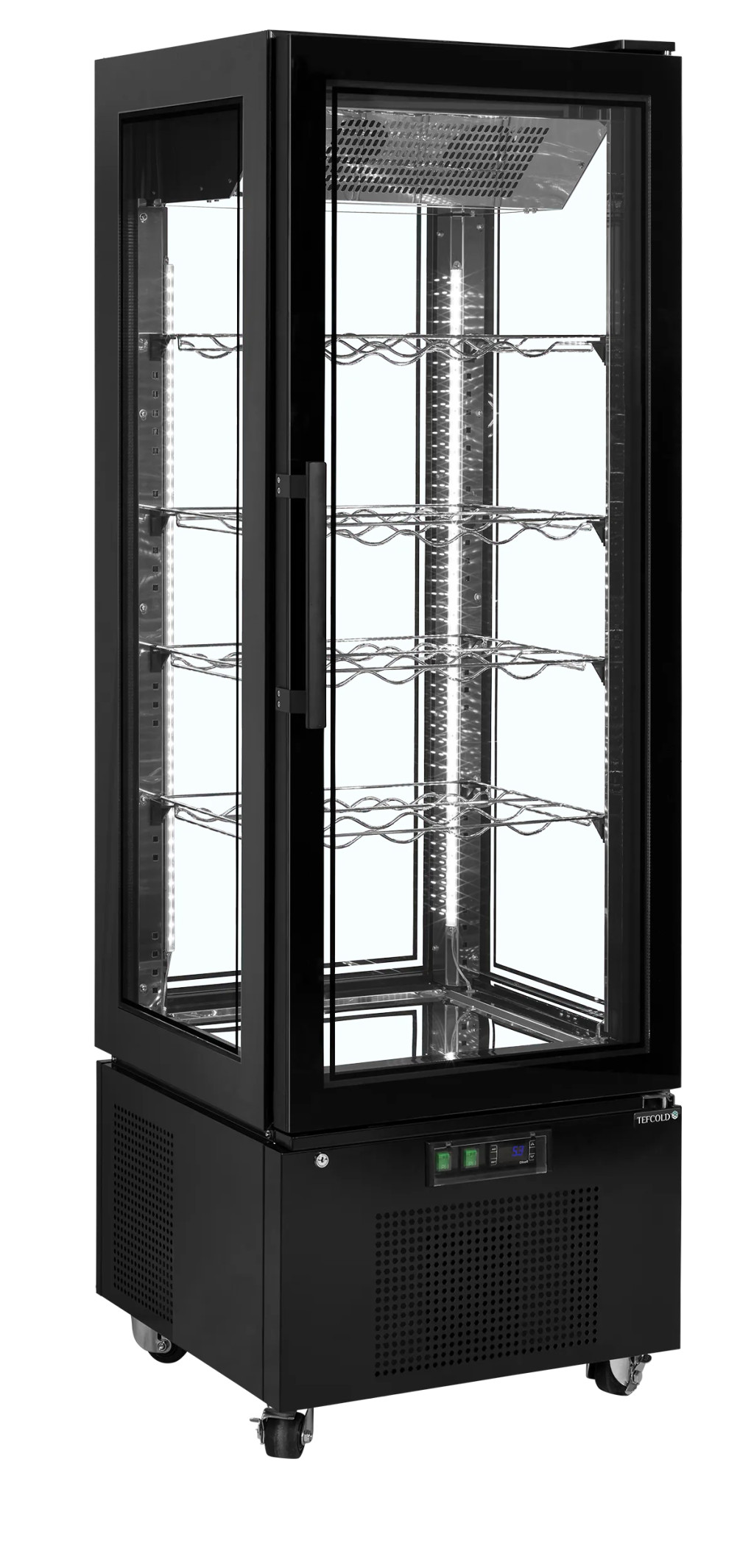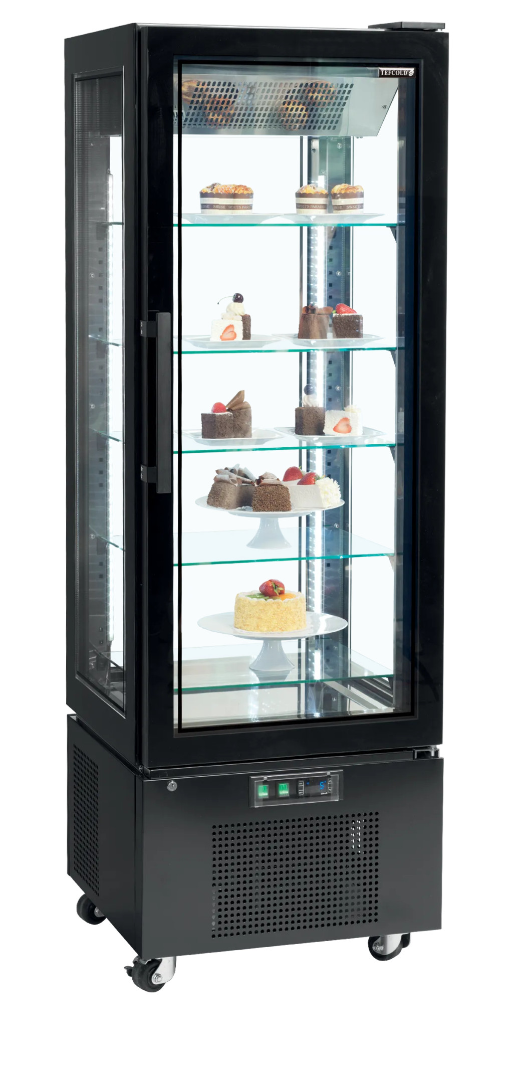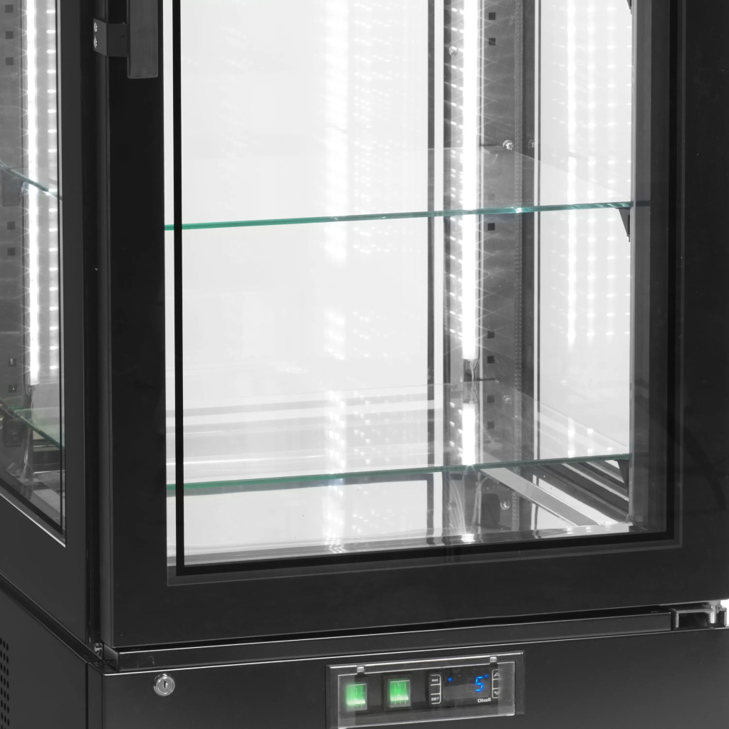 Tegye termékeit a figyelem középpontjába ezzel a lenyűgöző, négyoldali üvegezésű hűtővitrinnel! A modern, fekete acél külső, a keret nélküli dizájn és a tükrös hatású rozsdamentes acél belső garantálja, hogy süteményei és desszertjei páratlan eleganciával jelenjenek meg. A négy sarokban végigfutó vertikális LED világítás minden szintet tökéletesen megvilágít, kiemelve a termékek minden részletét. A ventilátoros hűtés egyenletes hőmérsékletet (+2 és +8 °C között) biztosít, míg az állítható üvegpolcok maximális rugalmasságot nyújtanak. Ez a vitrin nem csupán egy hűtőberendezés, hanem egy exkluzív bútordarab, amely növeli a vásárlási kedvet és emeli üzlete presztízsét.